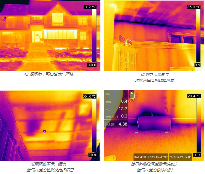 隔熱不足、濕氣入侵、建筑外圍結構缺陷是難于發現的關鍵故障。 全新的FLIR Exx系列紅外熱像儀提供優異的靈敏度和性能,能檢測到細微的溫差,較寬的視場角能瞄準寬廣的區域—因此,用戶可快速地定位并解決問題。